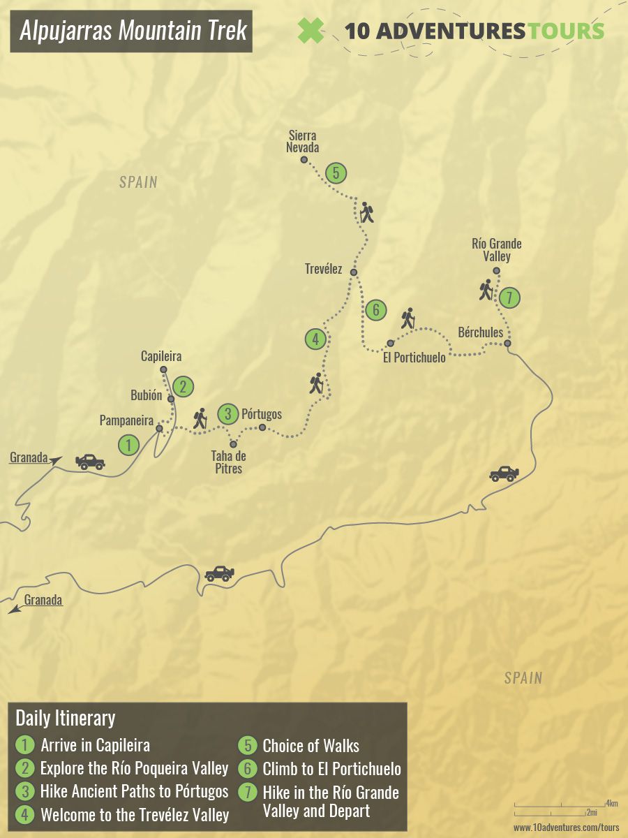 The trek ends in Bérchules. From Bérchules there are direct buses to Granada twice daily, and travel time is approximately 3.5 hours. If flying out of Málaga Airport (AGP), there is a direct bus from Granada, which takes approximately 2.5 hours. If flying out of Granada Airport (GRX), you can take public transport to get from Granada city center to the airport. Alternatively, you can arrange your own private transfer to your departure airport in advance.