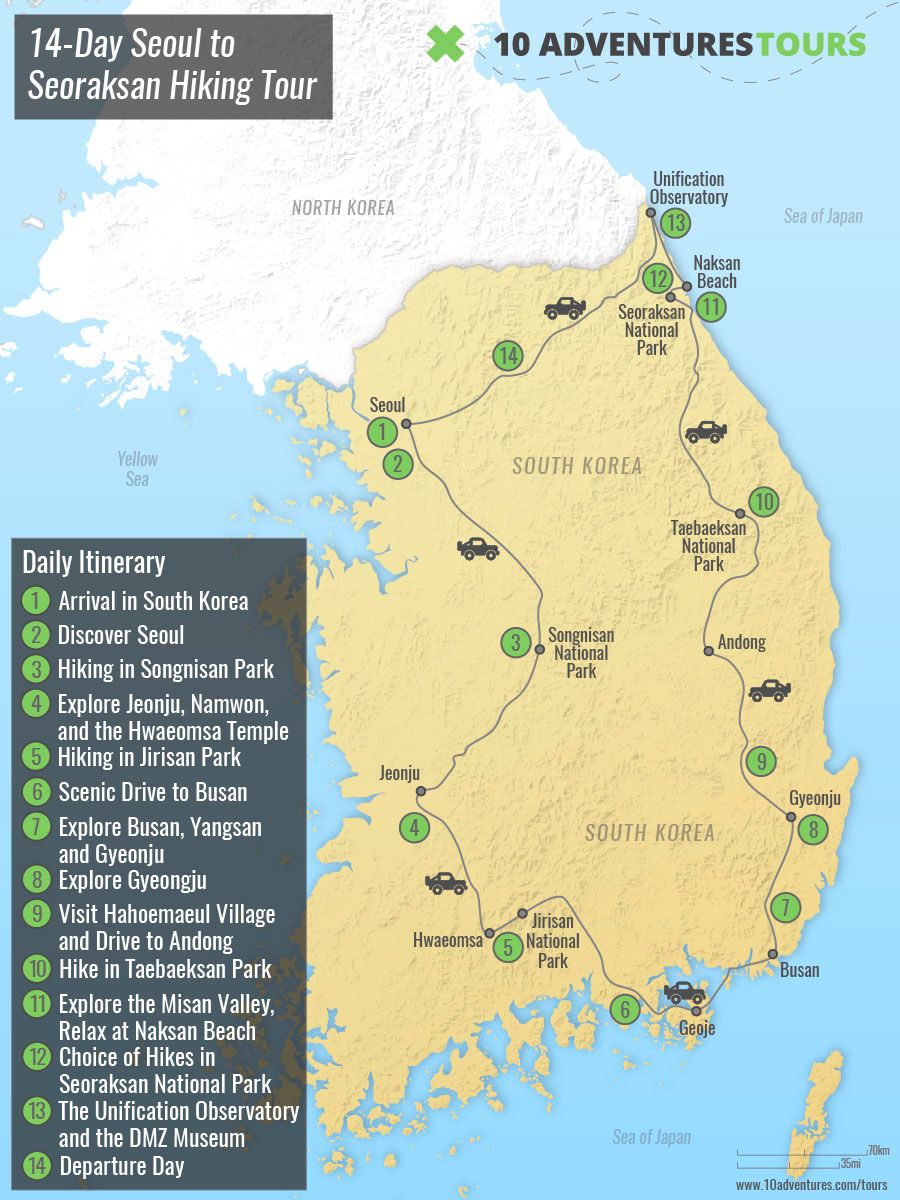 Trip map for 14-Day Seoul to Seoraksan Hiking Tour